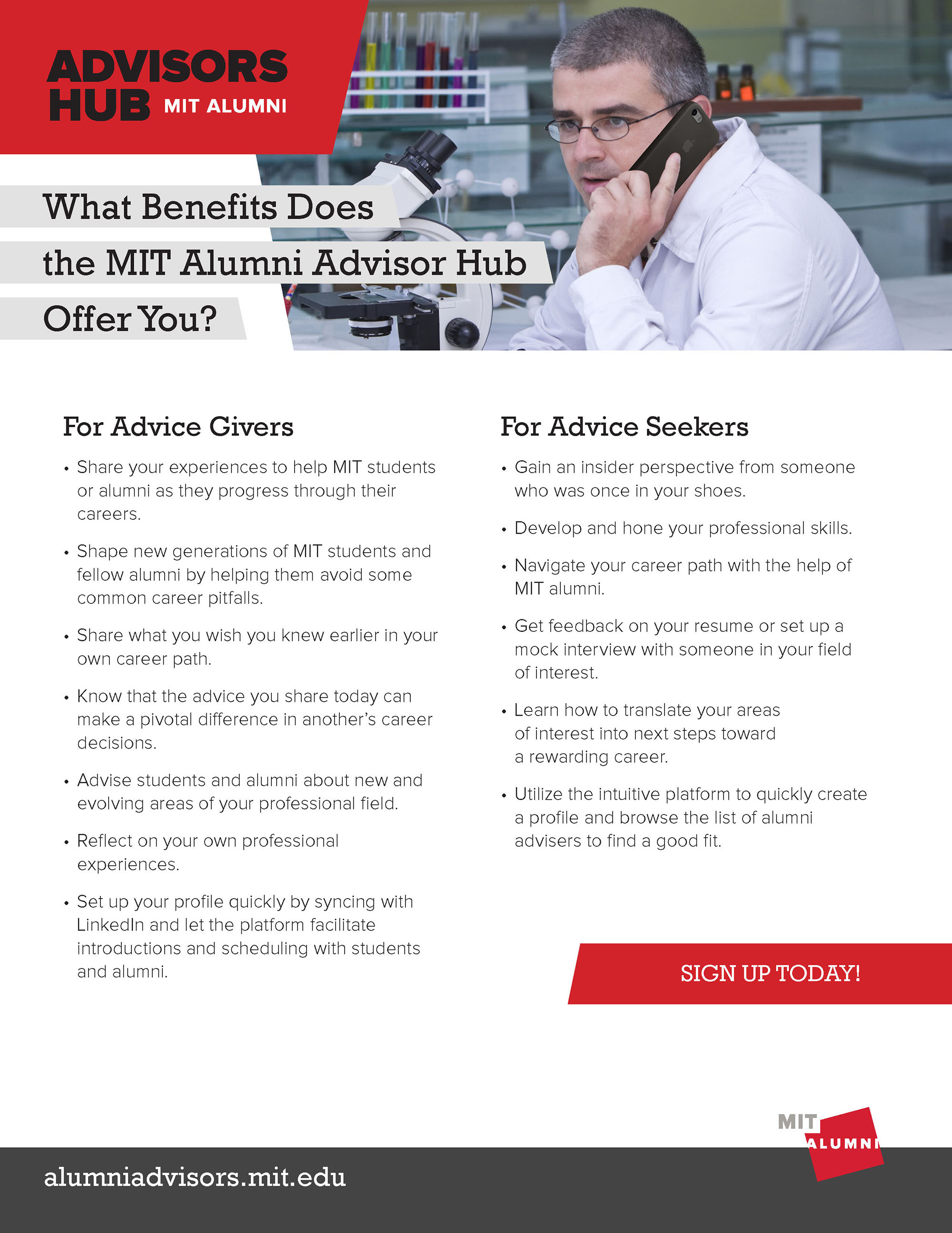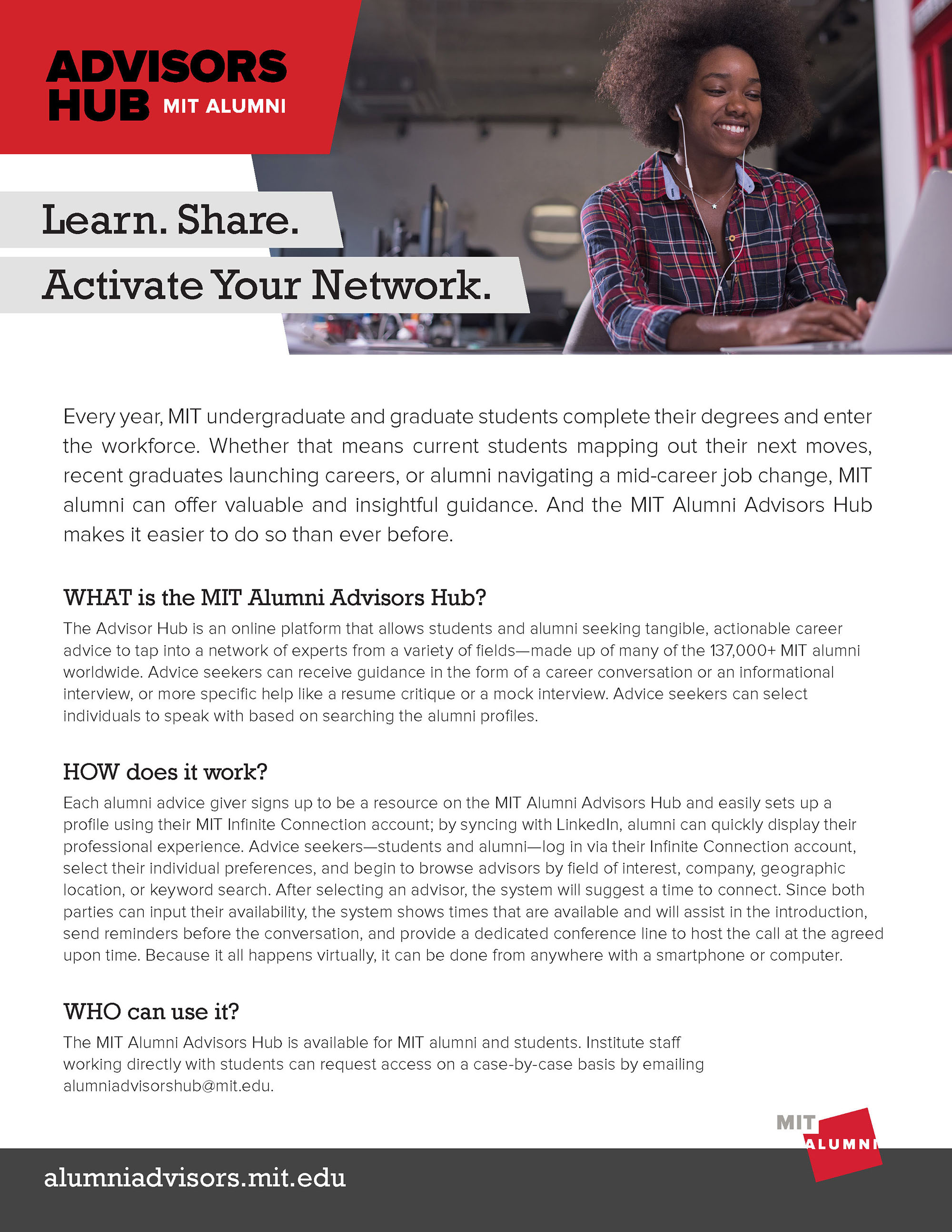 Marketing assets for a new program called Advisor Hub, where students or alumni can sign up and receive advise from MIT alumni. Assets include Email headers, one page information sheets, TV Displays, posters, and social media posts. And a poster for a CSAIL showcase event.